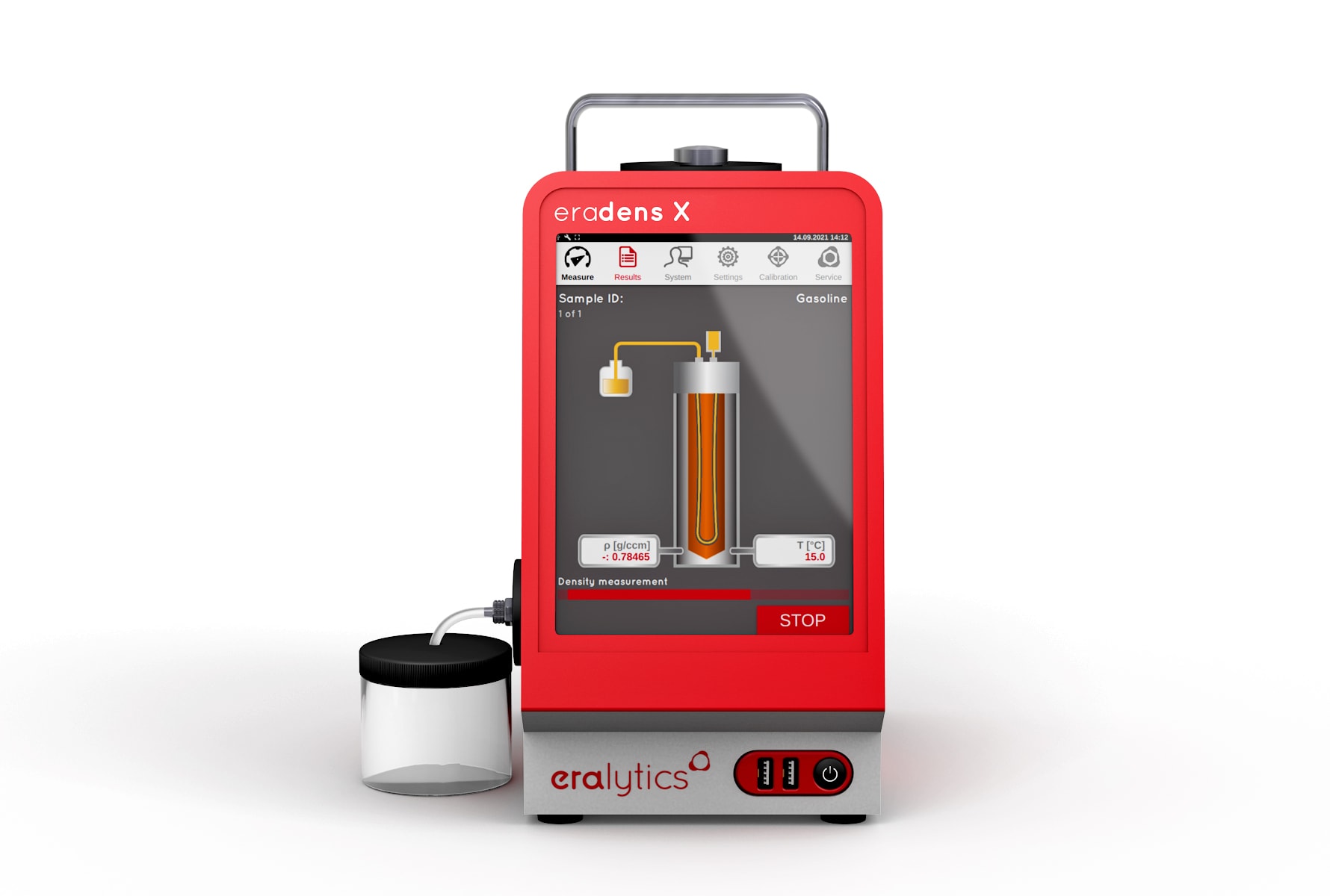 ERADENS X is the world's smallest and lightest high-precision density meter measuring in full compliance with ASTM D4052 and ISO 12185. It convinces with a rugged corrosion-resistant aluminum housing with most compact dimensions, still offering a large color touchscreen and a state-of-the-art built-in industry PC. With its revolutionary vertically aligned x-oscillation metal U-tube design, ERADENS X is extremely reliable and rugged. Unaffected by shocks and vibrations it is also perfect for testing under extreme conditions like inside mobile labs. ERADENS X provides density results with 5-digit precision. A unique full range viscosity correction ensures highest accuracy over the wide temperature range of 0 – 100 °C.