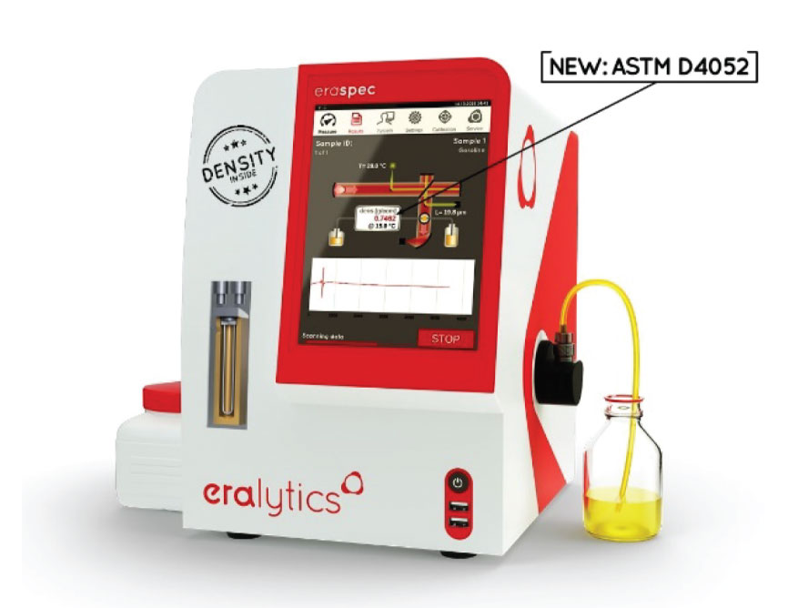 The fully automated FTIR spectrometer ERASPEC easily performs spectral fuel and oil analysis. With eralytics' latest innovation, the state-of-the-art temperature-controlled U-tube density meter module DENS4052, ERASPEC is again expanding the horizon of portable fuel testing.