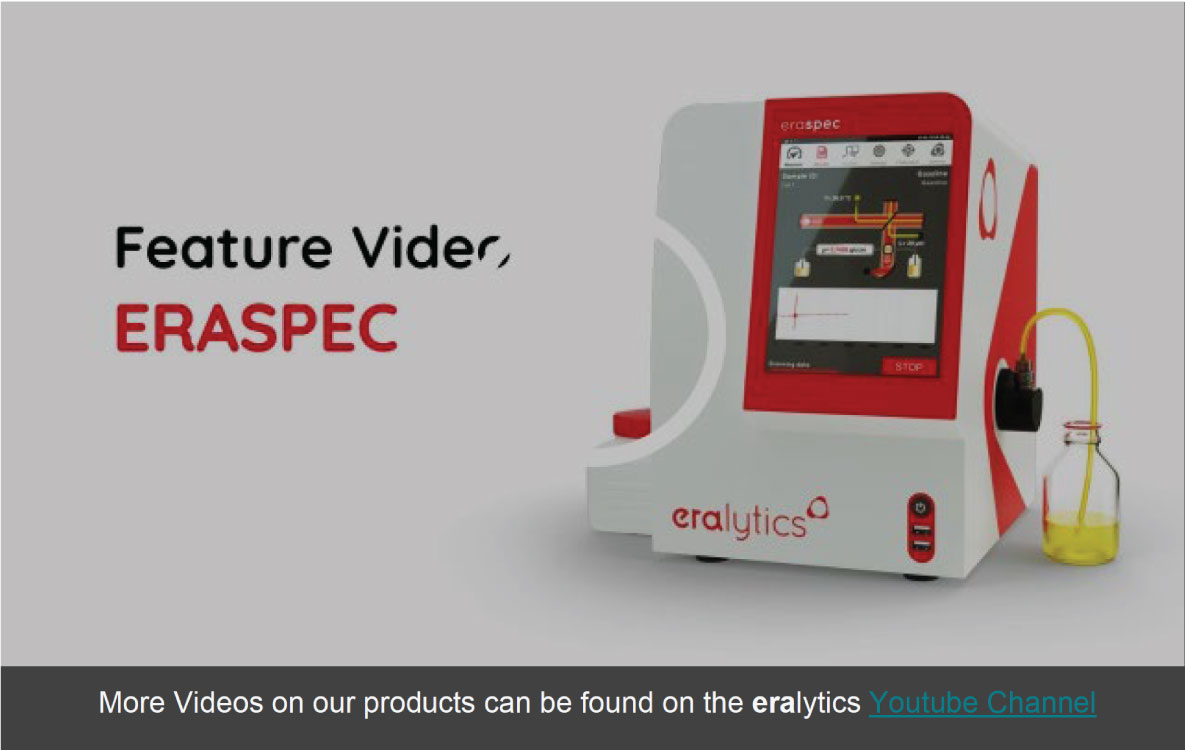 The fully automated FTIR spectrometer ERASPEC easily performs spectral fuel and oil analysis. With eralytics' latest innovation, the state-of-the-art temperature-controlled U-tube density meter module DENS4052, ERASPEC is again expanding the horizon of portable fuel testing.