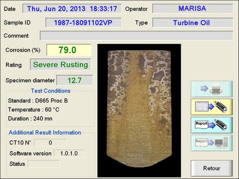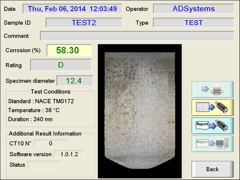 The CT10 test is simple and straight forward. The specimen is prepared according to the NACE TM0172 test procedure and is placed in the test chamber of the CT10. The operator enters sample information, using an intuitive graphical interface with touch screen panel, and starts a specimen scan. Specific light is emitted onto the suface of the specimen. The specimen is rotated and several images are taken. The software builds a flat image of the specimen suface, calculates the percentage of the corroded area and then translates it into a NACE rating. A detailed test report is ready in less than 5 minutes.