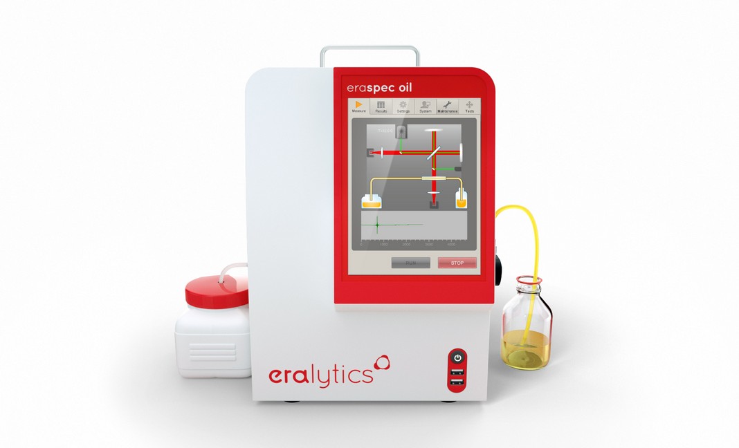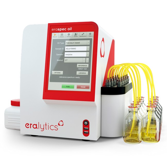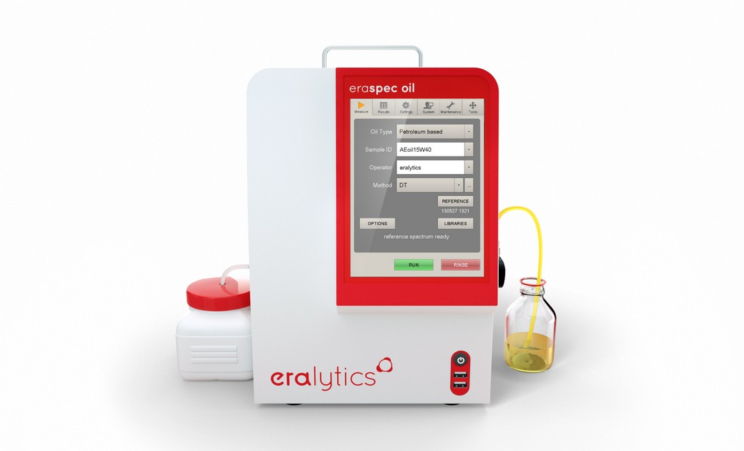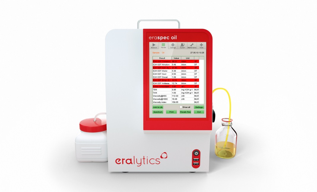 ERASPEC OIL is a portable stand-alone infrared analyzer for high-speed lubricant oil analysis and condition monitoring in full compliance with ASTM, DIN and JOAP methods. Its patented interferometer design delivers laboratory-grade results directly on site. ERASPEC OIL measures contaminants, degradation products, additive depletion as well as calculated properties like TAN, TBN, and viscosity within seconds.